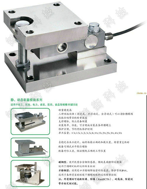 1.靜載稱重模塊:主要適用于側(cè)向力較小的靜載荷稱重場合。靜載稱重模塊可以非常方便地安裝在各種形狀的容器上。